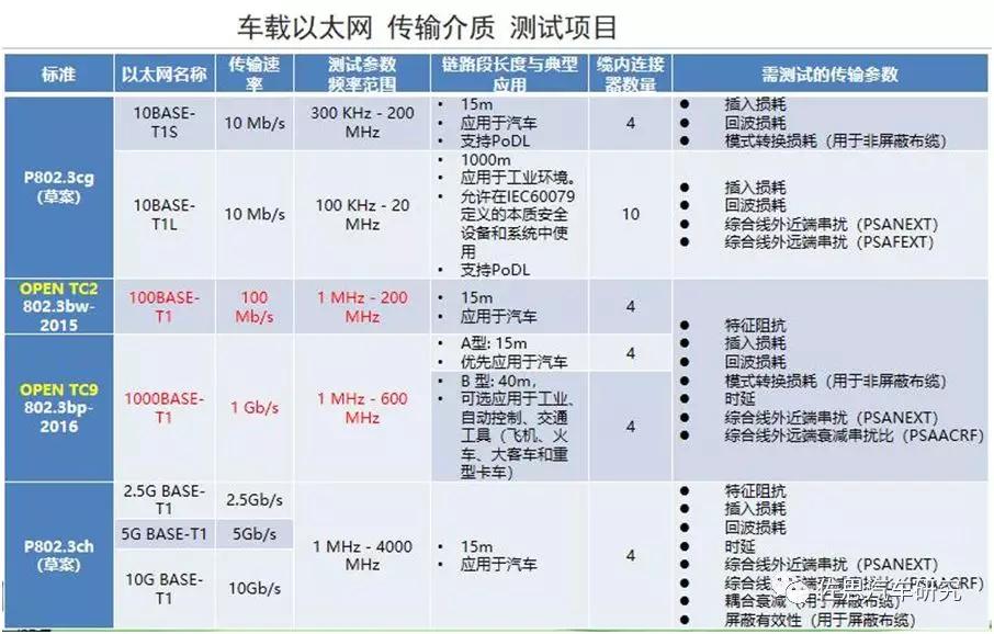 以太網(wǎng)技術(shù)這么好,怎么保證它的質(zhì)量呢?我們需要有量化的數(shù)據(jù)來評判以太網(wǎng)線束的傳輸質(zhì)量,這就涉及到了測試。下圖是目前國際上涉及到車載以太網(wǎng)的相關(guān)技術(shù)標(biāo)準(zhǔn),準(zhǔn)確講還不是汽車以太網(wǎng),而是單線對以太網(wǎng)傳輸介質(zhì)的標(biāo)準(zhǔn)。第一項(xiàng)描述的是用單個(gè)線對傳輸10比特每秒的數(shù)據(jù),傳輸距離是1000米,這樣的傳輸應(yīng)用在通信場合,目前是草案階段,很快會(huì)成為正式標(biāo)準(zhǔn)公布。第二和第三部分分別是OPEN聯(lián)盟和IEEE同時(shí)采用的,OPENTC2工作組研究的是百兆比特每秒傳輸速率的單線對車載內(nèi)的介質(zhì)應(yīng)用,OPENTC9工作組是專門研究千兆以太網(wǎng)的傳輸速率的傳輸介質(zhì),這兩項(xiàng)目前已成為以太網(wǎng)傳輸介質(zhì)主流的發(fā)展方向,未來更高速率的傳輸技術(shù)也在研究中。