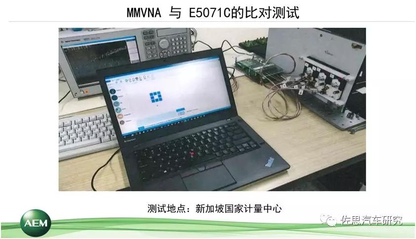 無論是測試方法或者測試設(shè)備,得到的數(shù)據(jù)是不是可信呢?我們和新加坡計(jì)量院有密切的合作關(guān)系,我們把所有的這些測試方案都在新加坡計(jì)量院做了一個(gè)比對。大家可以看到,下圖上這一臺(tái)大設(shè)備就是新加坡計(jì)量院的實(shí)驗(yàn)室網(wǎng)分,旁邊的就是我剛才給大家展示的,實(shí)驗(yàn)室狀態(tài)下我們的核心部件連接到線束以后的狀態(tài)。中間這臺(tái)電腦驅(qū)動(dòng)核心部件,完成測試。
